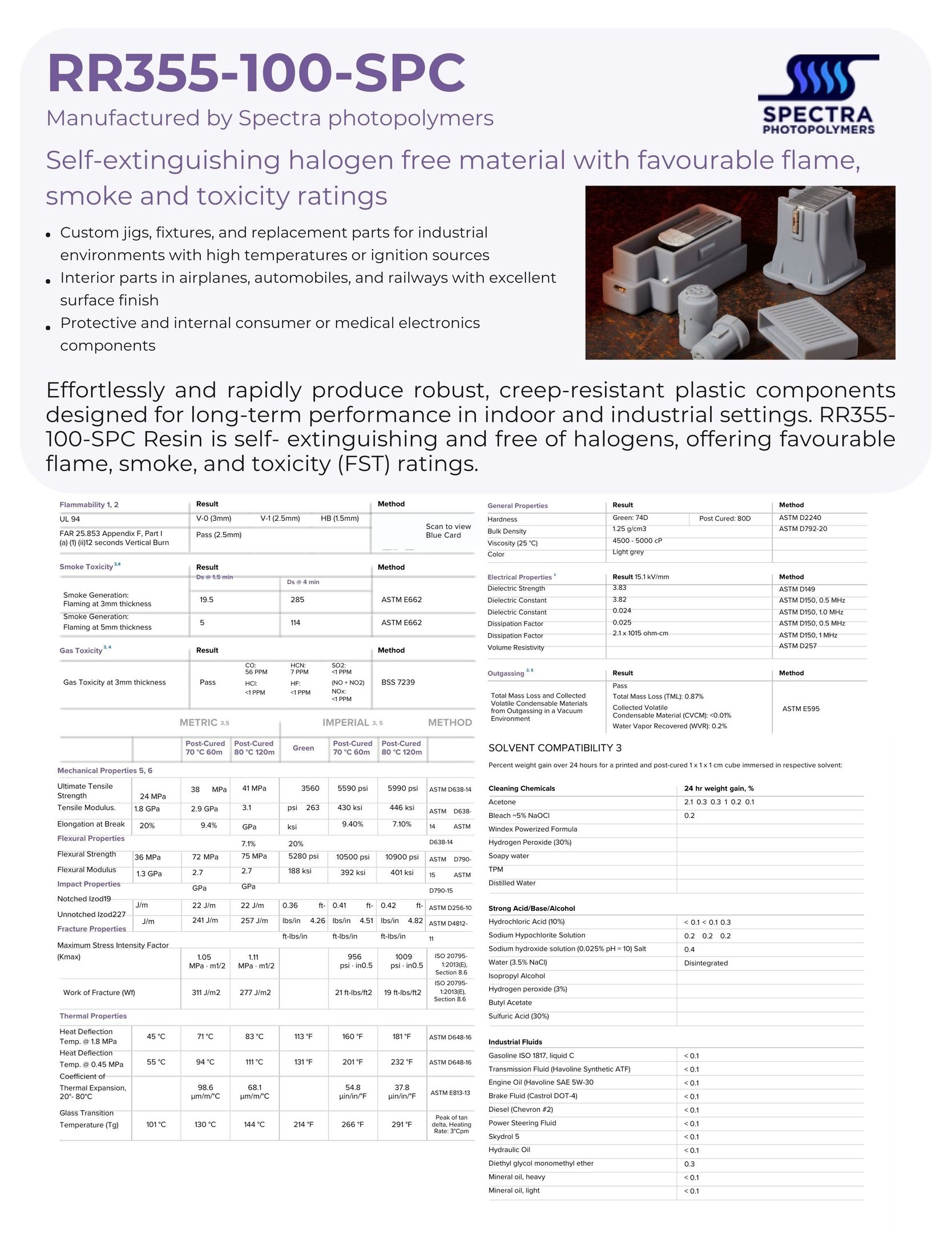 Creates durable, fire-resistant parts for long-lasting use in indoor and industrial environments. FR Resin is halogen-free and boasts favorable flame, smoke, and toxicity ratings.