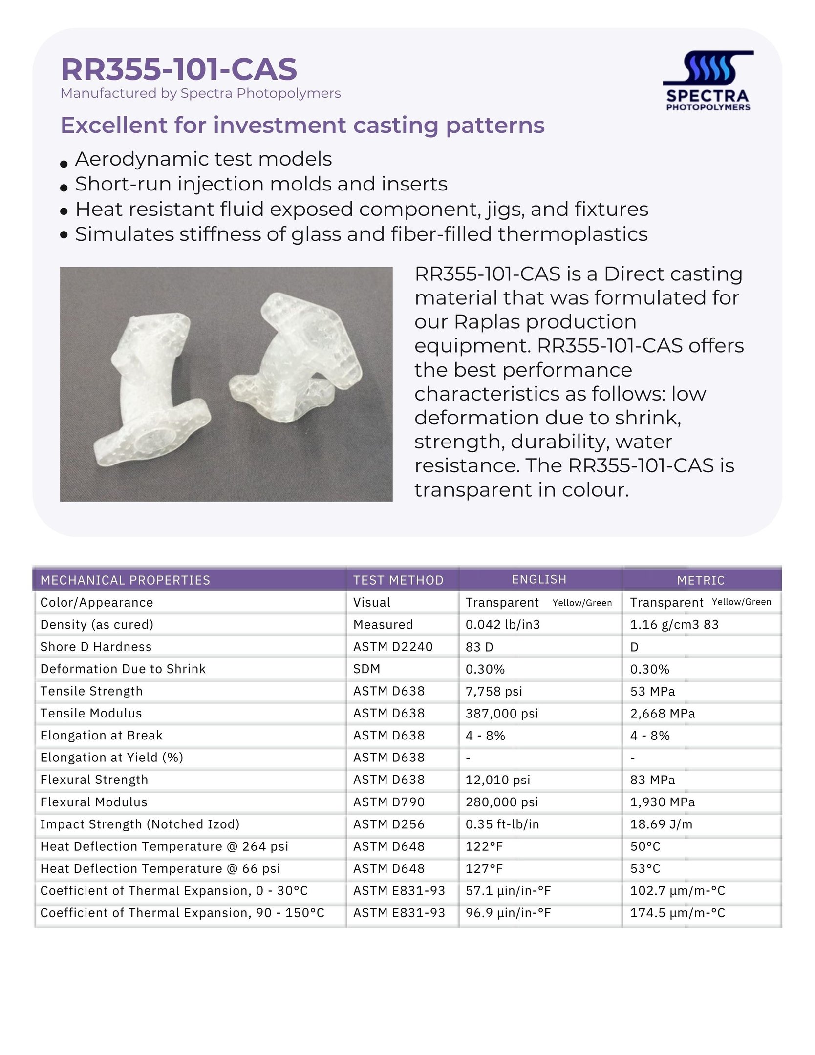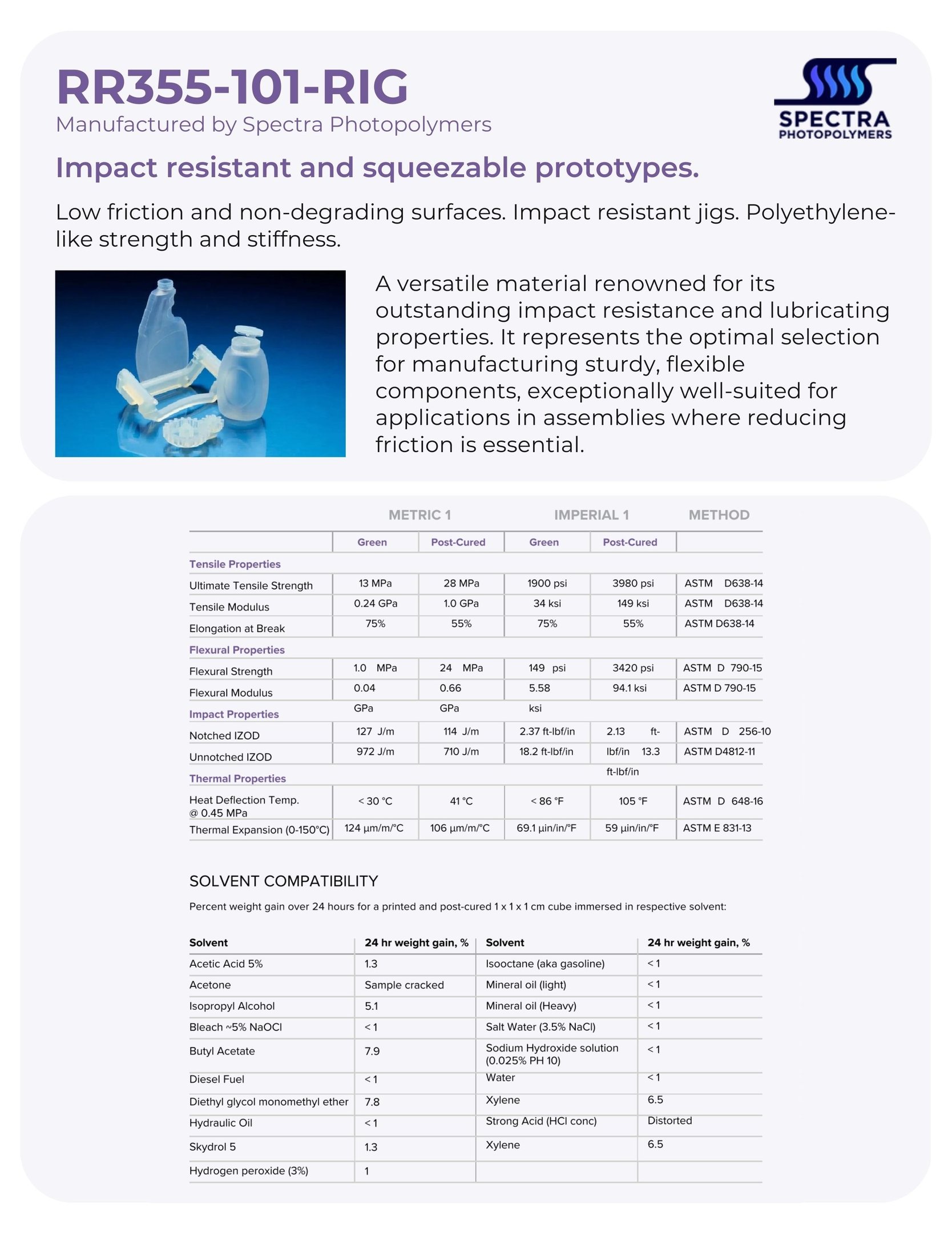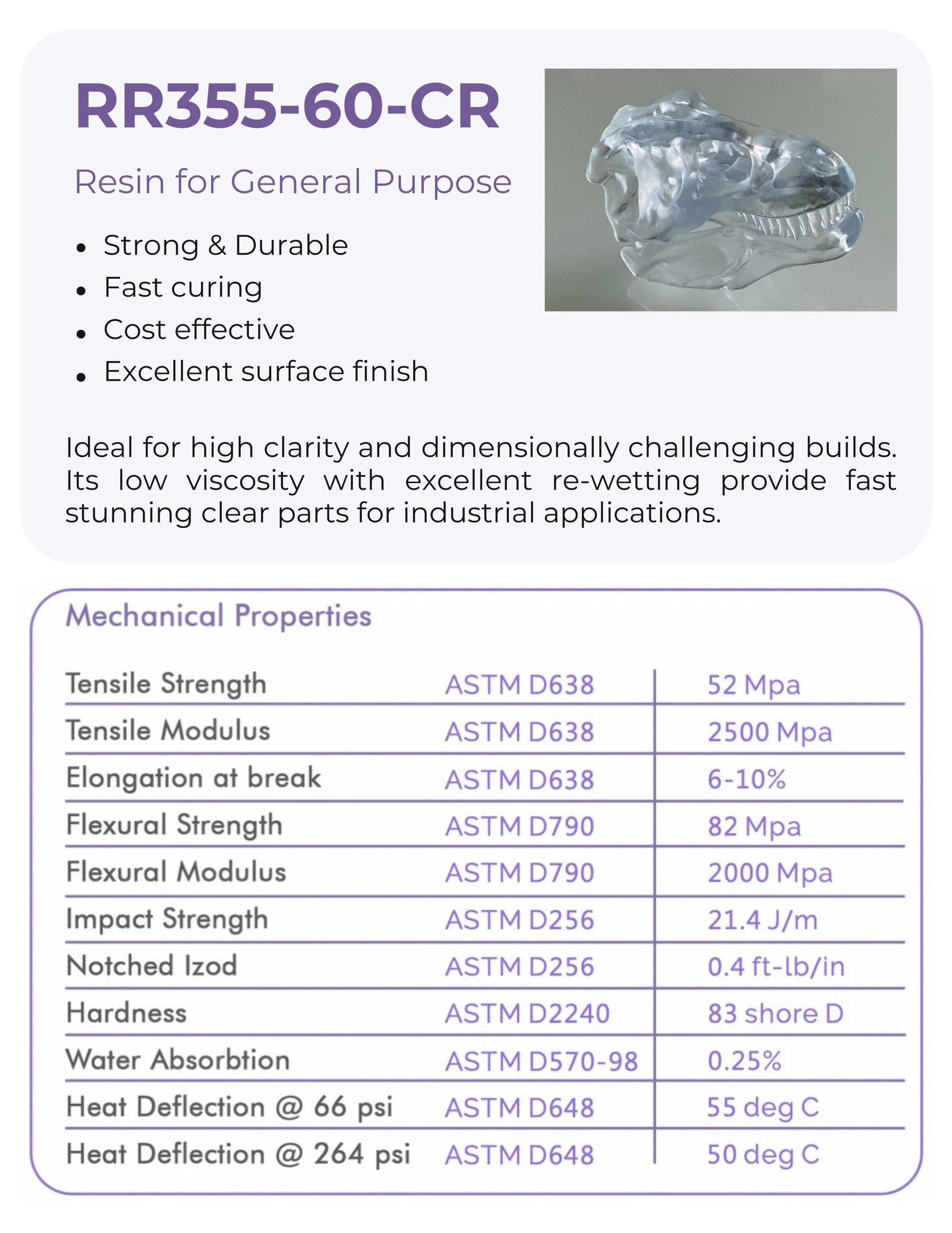An excellent general-purpose material for fine detail parts, its low viscosity and re-wetting properties facilitate fast build times, enhancing productivity.