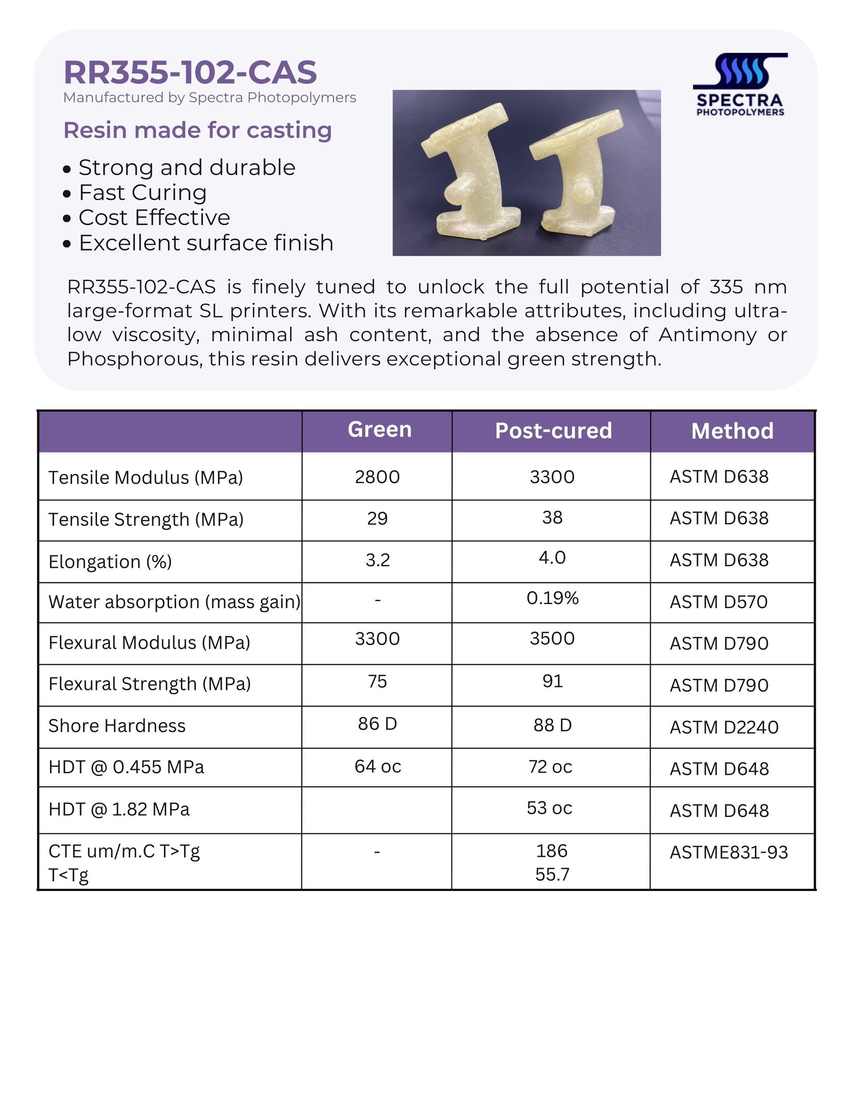 Tuned for open 335nm large-format SL printers, this resin has very low viscosity, no Antimony, no Phosphorous, low ash content, and excellent green strength.