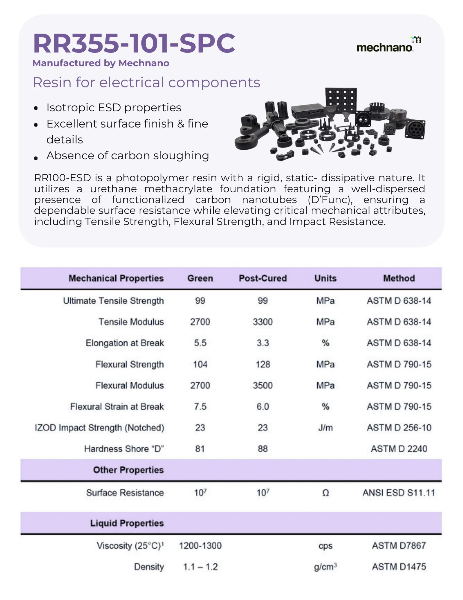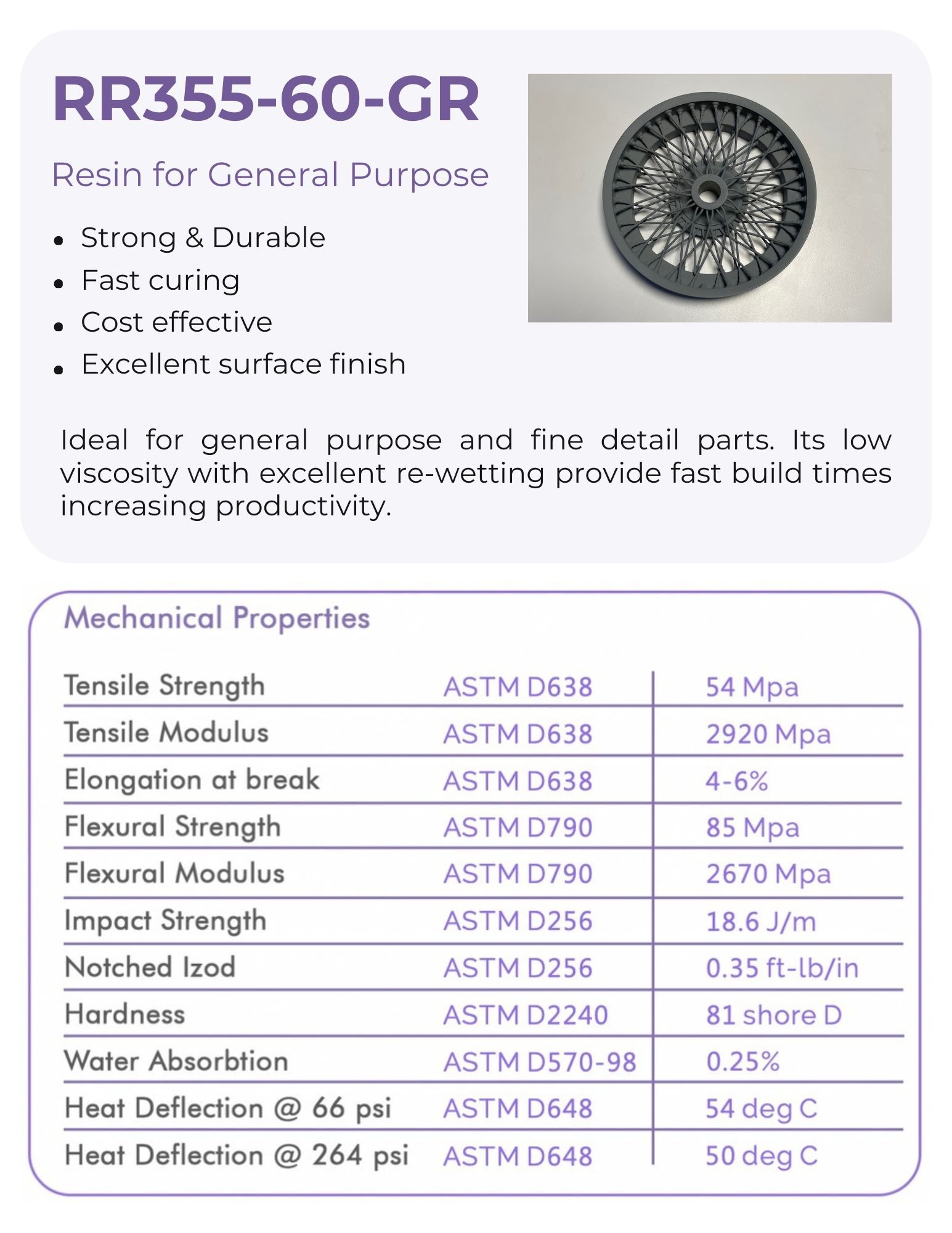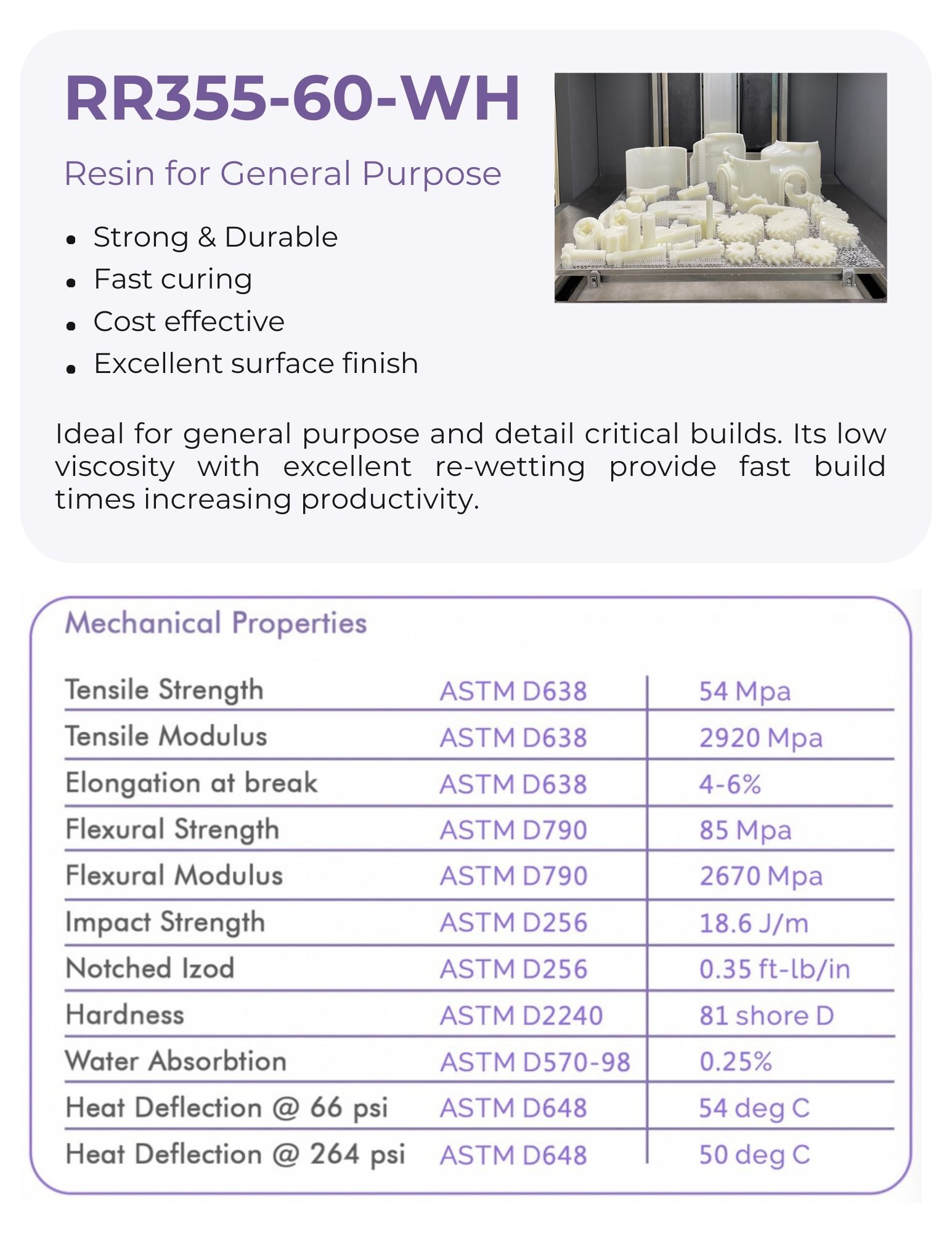 An excellent general-purpose material for fine detail parts, its low viscosity and re-wetting properties facilitate fast build times, enhancing productivity.